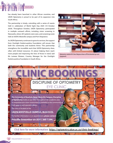 PHILANTHROPY MAGAZINEFEATURE12Optometry student Mr Simo Banjwa shows off the donated eye care equipment. has already been launched in other African countries, and UKZN Optometry is proud to be part of its expansion into South Africa.The partnership is timely, coinciding with a series of events held in celebration of World Sight Day 2024 (10 October 2024). Throughout October, UKZN Optometry participated in multiple outreach efforts, including vision screening in Newcastle, where 267 patients were seen, and screenings were held at UKZN%u2019s Westville campus and Port Shepstone. As UKZN Optometry continues to grow its services, the support from OneSight EssilorLuxottica Foundation will ensure that both the community and students thrive. %u2018This partnership strengthens the incredible work that UKZN Optometry does, often with limited resources. It%u2019s about helping them reach more people and improving the lives of those in need,%u2019 said Ms Lameez Eksteen, Country Manager for the OneSight EssilorLuxottica Foundation in South Africa.CLINIC BOOKINGSThe University of KwaZulu-Natal, Westville Campus, Discipline of Optometry%u00a0holds an eye clinic throughout the academic year.A%u00a0comprehensive vision assessment%u00a0is available to the community in both%u00a0general%u00a0and%u00a0specialist%u00a0clinics.DISCIPLINE OF OPTOMETRYEYE CLINICClick here for more information: https://optometry.ukzn.ac.za/clinic-bookings/The clinic is located at the%u00a0UKZN-WESTVILLE CAMPUS, BLOCK E5.For further information or an appointment,%u00a0please contact: Priscilla Sewambar on (031) 260 7294.