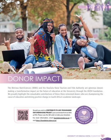 UNIVERSITY OF KWAZULU-NATAL FOUNDATION 17DONOR IMPACTThe M%u00e9rieux NutriSciences (MXNS) and the KwaZulu-Natal Tourism and Film Authority are generous donors making a transformative impact on the future of education at the University through the UKZN Foundation. We proudly highlight the remarkable contributions of these three esteemed donors who are championing the cause of education and driving positive change in South Africa%u2019s academic landscape. Should you wish to CONTRIBUTE TO ANY PROGRAMME OR FUNDRAISING PROJECT, you can donate from as little as R50. Please scan the QR code to make your donation. For more information, email foundation@ukzn.ac.za or visit https://foundation.ukzn.ac.za/DONORS