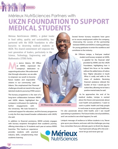 18 PHILANTHROPY MAGAZINEM%u00e9rieux NutriSciences (MXNS), a global leader in food safety, quality and sustainability, has partnered with the UKZN Foundation to offer bursaries to deserving medical students at UKZN. This shared commitment will empower the next generation of leaders, particularly in the Science, Technology, Engineering and Mathematics (STEM) fields.Ms Janice Adams, HR Officer at MXNS, expressed the company%u2019s dedication to supporting education. %u2018We understand that through education, we are able to empower our youth to become future leaders and responsible citizens in our community,%u2019 said Adams. She emphasised that %u2018financial challenges should not stand in the way of talented students pursuing STEM careers.%u2019The bursary programme is the start of a long-term collaboration between MXNS and UKZN. Adams highlighted the company%u2019s enthusiasm for exploring further engagements with the University. %u2018We look forward to continued support for education, and this bursary programme is only the first step toward broader collaboration with UKZN,%u2019 she said.In addition to financial assistance, MXNS actively engages with bursary recipients throughout their academic journey, offering internships to 10 students each year at various MXNS branches. This hands-on experience provides students with practical industry skills, complementing their academic learning.M%u00e9rieux NutriSciences Partners with UKZN FOUNDATION TO SUPPORT MEDICAL STUDENTSMr S%u2019Khona Letsipa, a final-year medical student.Several former bursary recipients have gone on to secure employment within the company, showcasing the success of the partnership between MXNS and UKZN in creating pathways for young graduates to enter the workforce and contribute to the industry.Mr S%u2019Khona Letsipa, a final-year medical student and bursary recipient at UKZN, is grateful for the financial relief provided by MXNS and the UKZN Foundation, highlighting how it helped him focus on his studies without the added stress of tuition fees. %u2018Higher education in South Africa is costly and adds to the stress of students. Receiving financial assistance relieved the burden of how I would pay for tuition fees, allowing me to have a positive mental state,%u2019 he said.As he approaches the end of his medical studies, Letsipa is excited about the future and passionate about rural health and paediatrics. %u2018I want to work in public health and help people in rural areas to access good healthcare. I%u2019m also passionate about child health, and I see myself specialising in paediatrics. The future holds a lot of possibilities, and I am excited to see what happens,%u2019 he said.Letsipa%u2019s message of resilience to fellow students is to, %u2018Never give up on your dreams, and even with the challenges you may face, remember that your ultimate goal is to finish the degree. Your hard work will pay off in the end %u2013 never let go and never give up.%u2019DONORS