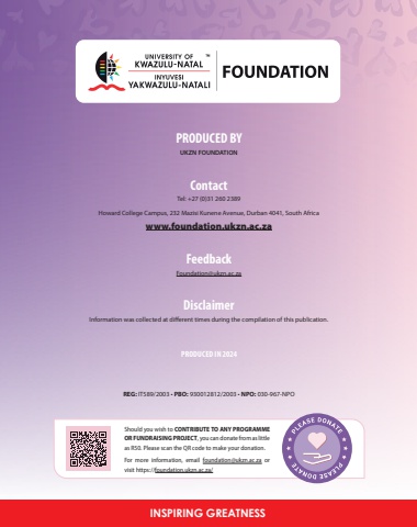 PHILANTHROPY MAGAZINEFEATURE26PRODUCED BYUKZN FOUNDATIONContactTel: +27 (0)31 260 2389Howard College Campus, 232 Mazisi Kunene Avenue, Durban 4041, South Africa www.foundation.ukzn.ac.zaFeedbackFoundation@ukzn.ac.zaDisclaimerInformation was collected at different times during the compilation of this publication.PRODUCED IN 2024REG: IT589/2003 %u2022 PBO: 930012812/2003 %u2022 NPO: 030-967-NPOINSPIRING GREATNESSShould you wish to CONTRIBUTE TO ANY PROGRAMME OR FUNDRAISING PROJECT, you can donate from as little as R50. Please scan the QR code to make your donation.For more information, email foundation@ukzn.ac.za or visit https://foundation.ukzn.ac.za/