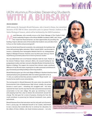 UNIVERSITY OF KWAZULU-NATAL FOUNDATION 7UKZN alumna Ms Simangele Msweli-Ratsoana. COVER FEATUREMsweli-Ratsoana is the Senior Manager of the Youth Leadership Program at the African Wildlife Foundation (AWF). UKZN Alumnus Provides Deserving Students WITH A BURSARYMELISSA MUNGROOUKZN alumna Ms Simangele Msweli-Ratsoana, who is based in Kenya, has committed bursaries of R25 000 for three consecutive years to sponsor Honours students in the field of Biological Sciences, which will be facilitated by the UKZN Foundation. Msweli-Ratsoana, who currently serves as the Senior Manager of the Charles R. Wall Youth Leadership Program at the African Wildlife Foundation (AWF), said, %u2018I know first- hand how financial barriers can limit opportunities. By providing this funding, I hope to alleviate some of the burdens that students carry and allow them to focus on their studies and personal growth.%u2019Since her family faced financial constraints, she understands the hardships that come with pursuing higher education. %u2018When I joined UKZN, I was fortunate to receive a scholarship from Isimangaliso Wetland Park for my undergraduate degree in Biological Sciences. However, once my three years were up, I found myself facing uncertainty about how to fund my Honours studies.%u2019 She was determined not to let financial obstacles hold her back. Thanks to her lecturer Professor Steven Johnson%u2019s efforts, she secured funding for her postgraduate studies and later received a Mandela Rhodes Scholarship for her Masters in Biology. The support she received from Johnson made a profound difference in her life and career, inspiring her to make a personal commitment to pay it forward by providing funding to deserving students.Msweli-Ratsoana grew up in the rural village of Mfekayi in Northern KwaZulu-Natal, raised primarily by her grandmother after her mother gave birth to her at 17, who, as a cashier at that time, earned a modest R2 100 per month %u2013 an income far too small to cover university fees.The turning point in Msweli-Ratsoana%u2019s life came when she joined the Environmental Club at Masibonisane High School. Initially, she joined because it wasn%u2019t sport %u2013 something she struggled with %u2013 but what captured her heart was the way that the club connected environmental conservation to her own village. She grew up swimming in rivers and enjoying local fruit, only to witness the environment around her change. The club gave her a sense of purpose, showing her how she could contribute to preserving her beloved homeland%u2019s rivers, plants and animals.Msweli-Ratsoana knew that education was her only path out of poverty. From a young age, she dedicated herself to her studies, determined to earn a bursary that would allow her to continue her education. As the eldest of three children, she faced immense pressure %u2013 not only