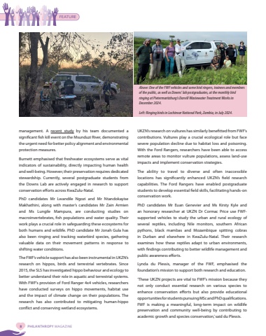 FEATURE8 PHILANTHROPY MAGAZINELeft: Ringing birds in Lochinvar National Park, Zambia, in July 2024. Above: One of the FWF vehicles and some bird ringers, trainees and members of the public, as well as Downs%u2019 lab postgraduates, at the monthly bird ringing at Pietermaritzburg%u2019s Darvill Wastewater Treatment Works in December 2024.management. A recent study by his team documented a significant fish kill event on the Msunduzi River, demonstrating the urgent need for better policy alignment and environmental protection measures.Burnett emphasised that freshwater ecosystems serve as vital indicators of sustainability, directly impacting human health and well-being. However, their preservation requires dedicated stewardship. Currently, several postgraduate students from the Downs Lab are actively engaged in research to support conservation efforts across KwaZulu-Natal. PhD candidates Mr Lwandile Ngozi and Mr Ntandokayise Makhathini, along with master%u2019s candidates Mr Zain Armien and Ms Lungile Mampura, are conducting studies on macroinvertebrates, fish populations and water quality. Their work plays a crucial role in safeguarding these ecosystems for both humans and wildlife. PhD candidate Mr Jonah Gula has also been ringing and tracking waterbird species, gathering valuable data on their movement patterns in response to shifting water conditions.The FWF%u2019s vehicle support has also been instrumental in UKZN%u2019s research on hippos, birds and terrestrial vertebrates. Since 2015, the SLS has investigated hippo behaviour and ecology to better understand their role in aquatic and terrestrial systems. With FWF%u2019s provision of Ford Ranger 4x4 vehicles, researchers have conducted surveys on hippo movements, habitat use and the impact of climate change on their populations. The research has also contributed to mitigating human-hippo conflict and conserving wetland ecosystems.UKZN%u2019s research on vultures has similarly benefitted from FWF%u2019s contributions. Vultures play a crucial ecological role but face severe population decline due to habitat loss and poisoning. With the Ford Rangers, researchers have been able to access remote areas to monitor vulture populations, assess land-use impacts and implement conservation strategies.The ability to travel to diverse and often inaccessible locations has significantly enhanced UKZN%u2019s field research capabilities. The Ford Rangers have enabled postgraduate students to develop essential field skills, facilitating hands-on conservation work.PhD candidates Mr Euan Genevier and Ms Kirsty Kyle and an honorary researcher at UKZN Dr Cormac Price use FWFsupported vehicles to study the urban and rural ecology of several reptiles, including Nile monitors, southern African pythons, black mambas and Mozambique spitting cobras in Durban and elsewhere in KwaZulu-Natal. Their research examines how these reptiles adapt to urban environments, with findings contributing to better wildlife management and public awareness efforts.Lynda du Plessis, manager of the FWF, emphasised the foundation%u2019s mission to support both research and education. %u2018These UKZN projects are vital to FWF%u2019s mission because they not only conduct essential research on various species to enhance conservation efforts but also provide educational opportunities for students pursuing MSc and PhD qualifications. FWF is making a meaningful, long-term impact on wildlife preservation and community well-being by contributing to academic growth and species conservation,%u2019 said du Plessis.
