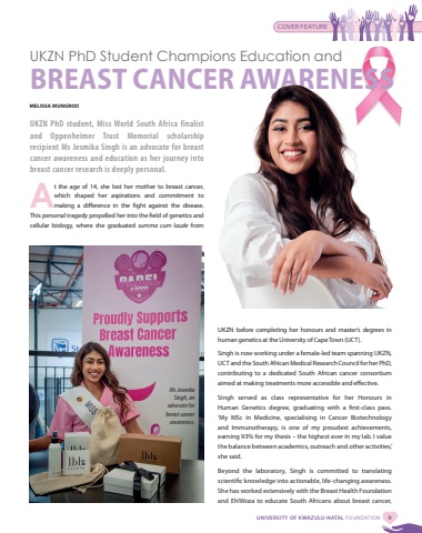 UNIVERSITY OF KWAZULU-NATAL FOUNDATION 9COVER FEATUREUKZN PhD Student Champions Education and BREAST CANCER AWARENESSMELISSA MUNGROOUKZN PhD student, Miss World South Africa finalist and Oppenheimer Trust Memorial scholarship recipient Ms Jesmika Singh is an advocate for breast cancer awareness and education as her journey into breast cancer research is deeply personal. At the age of 14, she lost her mother to breast cancer, which shaped her aspirations and commitment to making a difference in the fight against the disease. This personal tragedy propelled her into the field of genetics and cellular biology, where she graduated summa cum laude from Ms Jesmika Singh, an advocate for breast cancer awareness. UKZN before completing her honours and master%u2019s degrees in human genetics at the University of Cape Town (UCT). Singh is now working under a female-led team spanning UKZN, UCT and the South African Medical Research Council for her PhD, contributing to a dedicated South African cancer consortium aimed at making treatments more accessible and effective.Singh served as class representative for her Honours in Human Genetics degree, graduating with a first-class pass. %u2018My MSc in Medicine, specialising in Cancer Biotechnology and Immunotherapy, is one of my proudest achievements, earning 93% for my thesis %u2013 the highest ever in my lab. I value the balance between academics, outreach and other activities,%u2019 she said. Beyond the laboratory, Singh is committed to translating scientific knowledge into actionable, life-changing awareness. She has worked extensively with the Breast Health Foundation and Eh!Woza to educate South Africans about breast cancer,