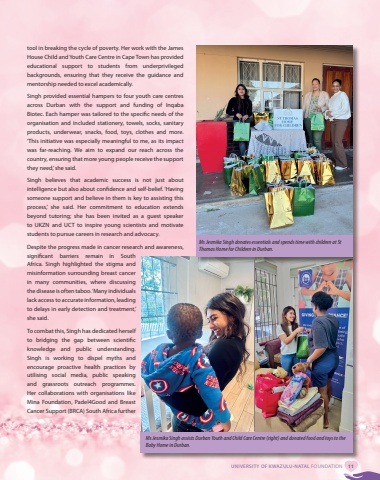 tool in breaking the cycle of poverty. Her work with the James House Child and Youth Care Centre in Cape Town has provided educational support to students from underprivileged backgrounds, ensuring that they receive the guidance and mentorship needed to excel academically.Singh provided essential hampers to four youth care centres across Durban with the support and funding of Inqaba Biotec. Each hamper was tailored to the specific needs of the organisation and included stationery, towels, socks, sanitary products, underwear, snacks, food, toys, clothes and more. %u2018This initiative was especially meaningful to me, as its impact was far-reaching. We aim to expand our reach across the country, ensuring that more young people receive the support they need,%u2019 she said. Singh believes that academic success is not just about intelligence but also about confidence and self-belief. %u2018Having someone support and believe in them is key to assisting this process,%u2019 she said. Her commitment to education extends beyond tutoring; she has been invited as a guest speaker to UKZN and UCT to inspire young scientists and motivate students to pursue careers in research and advocacy.Despite the progress made in cancer research and awareness, significant barriers remain in South Africa. Singh highlighted the stigma and misinformation surrounding breast cancer in many communities, where discussing the disease is often taboo. %u2018Many individuals lack access to accurate information, leading to delays in early detection and treatment,%u2019 she said. To combat this, Singh has dedicated herself to bridging the gap between scientific knowledge and public understanding. Singh is working to dispel myths and encourage proactive health practices by utilising social media, public speaking and grassroots outreach programmes. Her collaborations with organisations like Mina Foundation, Padel4Good and Breast Cancer Support (BRCA) South Africa further UNIVERSITY OF KWAZULU-NATAL FOUNDATION 11Ms Jesmika Singh assists Durban Youth and Child Care Centre (right) and donated food and toys to the Baby Home in Durban. Ms Jesmika Singh donates essentials and spends time with children at St Thomas Home for Children in Durban.