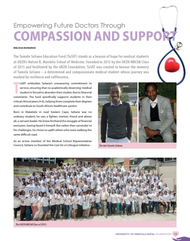 UNIVERSITY OF KWAZULU-NATAL FOUNDATION 15Empowering Future Doctors Through COMPASSION AND SUPPORTMELISSA MUNGROOThe Tumelo Seliane Education Fund (TuSEF) stands as a beacon of hope for medical students at UKZN%u2019s Nelson R. Mandela School of Medicine. Founded in 2015 by the UKZN MBChB Class of 2015 and facilitated by the UKZN Foundation, TuSEF was created to honour the memory of Tumelo Seliane %u2013 a determined and compassionate medical student whose journey was marked by resilience and selflessness.TuSEF embodies Seliane%u2019s unwavering commitment to service, ensuring that no academically deserving medical student is forced to abandon their studies due to financial constraints. The fund specifically supports students in their critical clinical years (4-6), helping them complete their degrees and contribute to South Africa%u2019s healthcare system.Born in Matatiele in rural Eastern Cape, Seliane was no ordinary student; he was a fighter, mentor, friend and above all, a servant leader. He knew firsthand the struggle of financial exclusion, having faced it himself. But rather than surrender to his challenges, he chose to uplift others who were walking the same difficult road.As an active member of the Medical School Representative Council, Seliane co-founded the Care for a Colleague initiative %u2013 The late Tumelo Seliane. The UKZN MBChB Class of 2015.