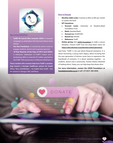 Upcoming Initiatives%u2022 TuSEF Re-launch (first semester 2025): A renewed campaign to reintroduce the fund and attract more donors.%u2022 Fun Run Fundraiser: A community-driven event to engage students, alumni and corporate sponsors.%u2022 10-Year Reunion of the Class of 2015 (end 2025): A milestone celebration of TuSEF%u2019s impact and a fundraising effort to meet the R1 million goal before the TuSEF 10th anniversary in 2026 post initial launch.%u2018Every student who receives help from TuSEF is another step toward a stronger healthcare system for South Africa. Your contribution %u2013 no matter how small %u2013 has the power to change a life,%u2019 said Kuse. How to Donate%u2022 Monthly debit order: Commit as little as R50 per month to sustain the fund.%u2022 EFT donations:o Account name: University of KwaZulu-Natal Foundation Trusto Bank: Standard Banko Account no: 242095305o Branch no: 045426o Reference: TuSEF%u2022 Online giving: Visit UKZN Foundation to make a secure donation. Choose TuSEF from the drop-down menu via https://ukzn.devman.co.za/devman/online/genomics/Said Kuse, %u2018TuSEF is not just about financial assistance. It is about honouring a young man%u2019s legacy, about ensuring that the next generation of doctors never have to experience the heartbreak of exclusion. It is about standing together %u2013 as students, alumni and a community. Tumelo Seliane dreamed of healing others. Today, you can help keep that dream alive.%u2019For more information, contact the UKZN Foundation at foundation@ukzn.ac.za or call +27 (0)31 260 2020.UNIVERSITY OF KWAZULU-NATAL FOUNDATION 17