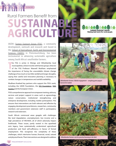 22 PHILANTHROPY MAGAZINERural Farmers Benefit fromSUSTAINABLE AGRICULTUREDONORSUKZN%u2019s Farmer Support Group (FSG), a community development, outreach and research unit based in the School of Agricultural, Earth and Environmental Sciences (SAEES) in Pietermaritzburg, has been instrumental in advancing sustainable agriculture among South Africa%u2019s smallholder farmers.The FSG is active in Msinga and Okhahlamba local municipalities, where it works with farmer groups. Director of the FSG Professor Maxwell Mudhara emphasised the importance of facing the unavoidable climate change challenge of too much or too little rainfall and longer droughts, saying that careful and innovative planning is necessary to combat changes in temperature and rainfall availability.Mudhara thanked key partners who support the FSG%u2019s work, including the UKZN Foundation, the HCI Foundation, DKA Austria and the European Union.FSG%u2019s comprehensive approach encompasses training, advisory services and project support in areas such as agroecology, nature conservation, institutional strengthening and enterprise development, including market participation. FSG ensures that interventions are both relevant and effective by engaging development practitioners, researchers, community members and government extension staff in participatory research and extension.South Africa%u2019s communal areas grapple with challenges like land degradation, unemployment, low income and a high prevalence of HIV/AIDS, all of which adversely impact livelihoods. These issues, partly rooted in the apartheid era%u2019s legacy, have systematically undermined agricultural production and food self-sufficiency in favour of formal employment. FSG recognises the complexity of these challenges, which intertwine human, financial, social, natural and physical facets. Their interventions are designed to address Okhahlamba Farmers: Market engagement %u2013 weighing green pepper harvest for market. Okhahlamba Farmers visit for practical learning in the field.