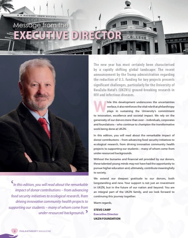 FEATURE2 PHILANTHROPY MAGAZINEMessage from the EXECUTIVE DIRECTORThe new year has most certainly been characterised by a rapidly shifting global landscape: The recent announcement by the Trump administration regarding the reduction of U.S. funding for key projects presents significant challenges, particularly for the University of KwaZulu-Natal%u2019s (UKZN%u2019s) ground-breaking research in HIV and infectious diseases. While this development underscores the uncertainties we face, it also reinforces the vital role that philanthropy plays in sustaining the University%u2019s commitment to innovation, excellence and societal impact. We rely on the generosity of our donors more than ever %u2013 individuals, corporates and foundations %u2013 who continue to champion the transformative work being done at UKZN.In this edition, you will read about the remarkable impact of donor contributions %u2013 from advancing food security initiatives to ecological research, from driving innovative community health projects to supporting our students %u2013 many of whom come from under-resourced backgrounds. Without the bursaries and financial aid provided by our donors, these talented young minds may not have had the opportunity to pursue higher education and, ultimately, contribute meaningfully to society. We extend our deepest gratitude to our donors, both longstanding and new. Your support is not just an investment in UKZN, but in the future of our nation and beyond. You are an integral part of the UKZN family, and we look forward to continuing this journey together.Warm regards,STEVE CAMPExecutive Director UKZN FOUNDATION%u2018In this edition, you will read about the remarkable impact of donor contributions %u2013 from advancing food security initiatives to ecological research, from driving innovative community health projects to supporting our students %u2013 many of whom come from under-resourced backgrounds.%u2019