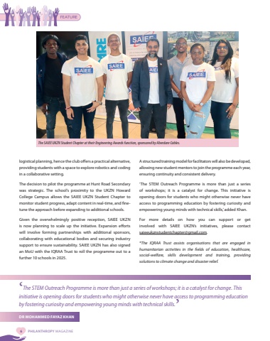 PHILANTHROPY MAGAZINEFEATURE6%u2018The STEM Outreach Programme is more than just a series of workshops; it is a catalyst for change. This initiative is opening doors for students who might otherwise never have access to programming education by fostering curiosity and empowering young minds with technical skills.%u2019DR MOHAMMED FAYAZ KHAN logistical planning, hence the club offers a practical alternative, providing students with a space to explore robotics and coding in a collaborative setting.The decision to pilot the programme at Hunt Road Secondary was strategic. The school%u2019s proximity to the UKZN Howard College Campus allows the SAIEE UKZN Student Chapter to monitor student progress, adapt content in real-time, and finetune the approach before expanding to additional schools.Given the overwhelmingly positive reception, SAIEE UKZN is now planning to scale up the initiative. Expansion efforts will involve forming partnerships with additional sponsors, collaborating with educational bodies and securing industry support to ensure sustainability. SAIEE UKZN has also signed an MoU with the IQRAA Trust to roll the programme out to a further 10 schools in 2025.The SAIEE UKZN Student Chapter at their Engineering Awards function, sponsored by Aberdare Cables. A structured training model for facilitators will also be developed, allowing new student mentors to join the programme each year, ensuring continuity and consistent delivery.%u2018The STEM Outreach Programme is more than just a series of workshops; it is a catalyst for change. This initiative is opening doors for students who might otherwise never have access to programming education by fostering curiosity and empowering young minds with technical skills,%u2019 added Khan. For more details on how you can support or get involved with SAIEE UKZN%u2019s initiatives, please contact saieeukznstudentchapter@gmail.com.*The IQRAA Trust assists organisations that are engaged in humanitarian activities in the fields of education, healthcare, social-welfare, skills development and training, providing solutions to climate change and disaster relief.