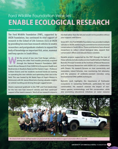 Ford Wildlife Foundation Vehicles ENABLE ECOLOGICAL RESEARCHCHRISTINE CU%u00c9NODThe Ford Wildlife Foundation (FWF), supported by UKZN Foundation, has continued its vital support of research in the School of Life Sciences (SLS) at UKZN by providing two new loan research vehicles to enable researchers and postgraduate students to expand the body of knowledge on important fish, avian, mammal and herp species in South Africa. With the arrival of two new Ford Ranger vehicles %u2013 joining the older Ford models previously acquired through the National Research Foundation (NRF) South African Research Chair (SARChI) in Ecosystem Health and Biodiversity in KwaZulu-Natal and the Eastern Cape %u2013 Professor Colleen Downs and her students received hands-on training on operating the new vehicles and optimising their use in the field. This was hosted by Mr Wade Pope of Pope%u2019s Motors in Richmond, with Mr James Wood also sharing valuable insights on vehicle handling and driving through rugged terrain.Downs expressed gratitude to the FWF and Ford dealerships for the two new loan research vehicles and their continued support of her team%u2019s research. %u2018Much of our research is done in The School of Life Sciences staff and students are pictured with the new Ford vehicles to support conservation efforts across KZN. the field rather than the lab and would not be possible without your support,%u2019 said Downs.Since 2017, the Ford Wildlife Foundation has provided multiple vehicles to UKZN, reinforcing its commitment to environmental conservation in South Africa. These contributions have allowed researchers to collect critical biological data, expand their conservation efforts and educate future scientists.Notable projects supported by the FWF through the loan of these vehicles include studies on river health led by Dr Matthew Burnett, Principal Scientist at the Institute of Natural Resources and an Honorary Researcher with UKZN%u2019s SLS, in collaboration with Downs. His research focuses on river connectivity and restoration, inland fisheries, river monitoring, fish telemetry and the presence of antibiotic-resistant microbes using Environmental DNA (eDNA) techniques.Burnett%u2019s work highlights the importance of freshwater ecosystems in sustaining livelihoods, particularly for rural communities. His research assesses the impact of nonnative species, ecotoxicology, and fish conservation, while also promoting educational initiatives on water resource UNIVERSITY OF KWAZULU-NATAL FOUNDATION 7