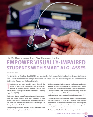 UNIVERSITY OF KWAZULU-NATAL FOUNDATION 9UKZN Becomes First SA University to EMPOWER VISUALLY-IMPAIRED STUDENTS WITH SMART AI GLASSESMELISSA MUNGROOThe University of KwaZulu-Natal (UKZN) has become the first university in South Africa to provide Envision Smart AI Glasses to five visually impaired students, Mr Bright Sello, Ms Thandeka Ngcobo, Ms Londiwe Ndaba, Mr Siboniso Mabuza and Ms Thembisa Xolo.This initiative was made possible mainly through the efforts of the UKZN Foundation who approached assistive technology provider Sensory Solutions (Pty) Ltd to provide these glasses to the University%u2019s Disability Support Unit (DSU).The Envision Glasses use artificial intelligence (AI) to empower blind and visually-impaired users with the ability to read printed and digital text, recognise faces, navigate environments and access real-time descriptions of their surroundings %u2013 all through discreet audio feedback. Each pair of glasses costs about R75 000 and comes with lifetime software updates and technical support.%u2018UKZN is proud to lead the way in implementing advanced assistive technology that speaks to the needs of our diverse student body,%u2019 said Mr Amith Ramballie, Head of the University%u2019s Disability Support Unit. %u2018These glasses not only reflect our commitment to accessibility but also our belief in every student%u2019s right to learn, grow and succeed independently.%u2019He continued, %u2018This milestone is particularly significant because no other university in South Africa currently offers students access to this device. While wearable assistive technology has existed for years, previous models were often more expensive or lacked functionality and reliability.%u2019 At the core of the Envision Glasses is a high-definition camera
