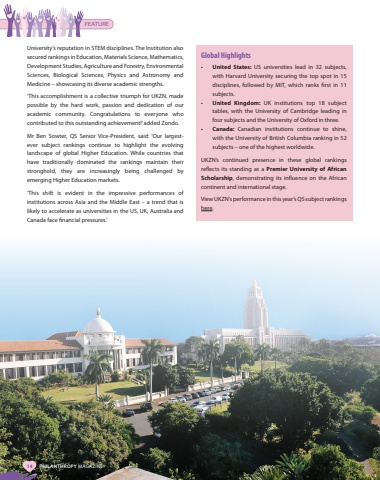 FEATUREUniversity%u2019s reputation in STEM disciplines. The Institution also secured rankings in Education, Materials Science, Mathematics, Development Studies, Agriculture and Forestry, Environmental Sciences, Biological Sciences, Physics and Astronomy and Medicine %u2013 showcasing its diverse academic strengths.%u2018This accomplishment is a collective triumph for UKZN, made possible by the hard work, passion and dedication of our academic community. Congratulations to everyone who contributed to this outstanding achievement!%u2019 added Zondo.Mr Ben Sowter, QS Senior Vice-President, said: %u2018Our largestever subject rankings continue to highlight the evolving landscape of global Higher Education. While countries that have traditionally dominated the rankings maintain their stronghold, they are increasingly being challenged by emerging Higher Education markets.%u2018This shift is evident in the impressive performances of institutions across Asia and the Middle East %u2013 a trend that is likely to accelerate as universities in the US, UK, Australia and Canada face financial pressures.%u2019 Global Highlights%u2022 United States: US universities lead in 32 subjects, with Harvard University securing the top spot in 15 disciplines, followed by MIT, which ranks first in 11 subjects.%u2022 United Kingdom: UK institutions top 18 subject tables, with the University of Cambridge leading in four subjects and the University of Oxford in three.%u2022 Canada: Canadian institutions continue to shine, with the University of British Columbia ranking in 52 subjects %u2013 one of the highest worldwide.UKZN%u2019s continued presence in these global rankings reflects its standing as a Premier University of African Scholarship, demonstrating its influence on the African continent and international stage.View UKZN%u2019s performance in this year%u2019s QS subject rankings here.14 PHILANTHROPY MAGAZINE