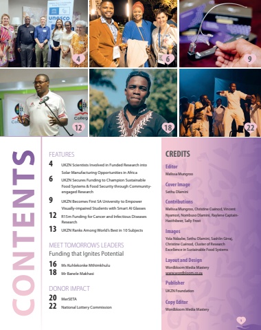 FEATURECONTENTSFEATURES4 UKZN Scientists Involved in Funded Research into Solar Manufacturing Opportunities in Africa6 UKZN Secures Funding to Champion Sustainable Food Systems & Food Security through Communityengaged Research9 UKZN Becomes First SA University to Empower Visually-impaired Students with Smart AI Glasses12 R15m Funding for Cancer and Infectious Diseases Research13 UKZN Ranks Among World%u2019s Best in 10 SubjectsMEET TOMORROWS LEADERSFunding that Ignites Potential16 Ms Kuhlekonke Mthimkhulu18 Mr Banele MakhasiDONOR IMPACT20 MerSETA22 National Lottery CommissionCREDITSEditorMelissa MungrooCover Image Sethu DlaminiContributionsMelissa Mungroo, Christine Cu%u00e9nod, Vincent Nyamori, Nombuso Dlamini, Raylene CaptainHasthibeer, Sally Frost ImagesYola Ndzabe, Sethu Dlamini, Sashlin Girraj, Christine Cu%u00e9nod, Cluster of Research Excellence in Sustainable Food SystemsLayout and DesignWordbloom Media Masterywww.wordbloom.co.zaPublisher UKZN FoundationCopy EditorWordbloom Media Mastery412 18 226 91