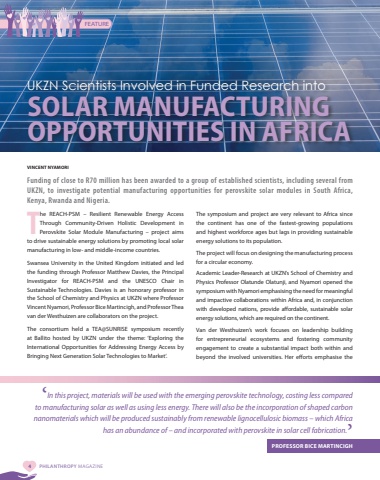 4 PHILANTHROPY MAGAZINEFEATUREUKZN Scientists Involved in Funded Research intoSOLAR MANUFACTURING OPPORTUNITIES IN AFRICAVINCENT NYAMORIFunding of close to R70 million has been awarded to a group of established scientists, including several from UKZN, to investigate potential manufacturing opportunities for perovskite solar modules in South Africa, Kenya, Rwanda and Nigeria.The REACH-PSM %u2013 Resilient Renewable Energy Access Through Community-Driven Holistic Development in Perovskite Solar Module Manufacturing %u2013 project aims to drive sustainable energy solutions by promoting local solar manufacturing in low- and middle-income countries.Swansea University in the United Kingdom initiated and led the funding through Professor Matthew Davies, the Principal Investigator for REACH-PSM and the UNESCO Chair in Sustainable Technologies. Davies is an honorary professor in the School of Chemistry and Physics at UKZN where Professor Vincent Nyamori, Professor Bice Martincigh, and Professor Thea van der Westhuizen are collaborators on the project.The consortium held a TEA@SUNRISE symposium recently at Ballito hosted by UKZN under the theme: %u2018Exploring the International Opportunities for Addressing Energy Access by Bringing Next Generation Solar Technologies to Market%u2018.The symposium and project are very relevant to Africa since the continent has one of the fastest-growing populations and highest workforce ages but lags in providing sustainable energy solutions to its population.The project will focus on designing the manufacturing process for a circular economy.Academic Leader-Research at UKZN%u2019s School of Chemistry and Physics Professor Olatunde Olatunji, and Nyamori opened the symposium with Nyamori emphasising the need for meaningful and impactive collaborations within Africa and, in conjunction with developed nations, provide affordable, sustainable solar energy solutions, which are required on the continent.Van der Westhuizen%u2019s work focuses on leadership building for entrepreneurial ecosystems and fostering community engagement to create a substantial impact both within and beyond the involved universities. Her efforts emphasise the %u2018In this project, materials will be used with the emerging perovskite technology, costing less compared to manufacturing solar as well as using less energy. There will also be the incorporation of shaped carbon nanomaterials which will be produced sustainably from renewable lignocellulosic biomass %u2013 which Africa has an abundance of %u2013 and incorporated with perovskite in solar cell fabrication.%u2019PROFESSOR BICE MARTINCIGH