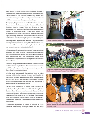 UNIVERSITY OF KWAZULU-NATAL FOUNDATION 7Professor Joyce Chitja, Director of the African Centre for Food Security (ACFS). food systems by placing communities at the heart of research and innovation. A transdisciplinary scientist and the first South African woman to earn a PhD in Food Security, she has long championed an approach that fuses rigorous academic inquiry with lived experience and indigenous knowledge.Her project, %u2018Empowerment of Smallholder Urban and PeriUrban Farmers for Improved Market Access and Food and Nutrition Security through Water Use Security in Agroprocessing%u2019, aims to improve livelihoods by providing targeted support to smallholder farmers %u2013 particularly women %u2013 in vulnerable urban spaces. The initiative leverages innovative agro-processing techniques, sustainable water use practices and localised capacity-building to generate real-world impact.Speaking on the importance of this work, Chitja noted, %u2018Food security challenges are most acutely felt at the local level. If we are to nourish communities and strengthen their resilience, our research must start, not end, with them,%u2019Chitja%u2019s passion for agricultural science and sustainability was cultivated early in life. Raised by a grandmother who practiced traditional yet effective farming techniques like intercropping, food preservation and soil conservation, Chitja found inspiration in her grassroots science long before encountering it in textbooks.%u2018Watching my grandmother%u2019s translation of basic science into real-life solutions inspired me to choose a career in science,%u2019 she said. %u2018That early exposure shaped my values, and my career has been about honouring that legacy.%u2019She has since risen through the academic ranks at UKZN, earning a BSc in Horticultural Sciences, an MSoc.Scie in Community Resource Management and her groundbreaking PhD in Food Security. She overcame considerable challenges linked to race, gender and age along the way, emerging as a fierce advocate for inclusivity in science.At the recent Committee on World Food Security (CFS) gathering in Rome, themed %u2018Nourish to Flourish: Strengthening Resilient Food Systems from Community Roots to Global Governance%u2019, Chitja co-led a panel discussion with Professor Jan Swanepoel of the University of the Free State. Their message was clear: universities must embrace community engagement as a strategic imperative if they are to produce research that truly matters.%u2018Community engagement is central to how we at UKZN approach food security challenges,%u2019 Chitja told the global Launch of the African Research Universities Alliance (ARUA) Centre of Excellence at the University of Pretoria, of which UKZN is a part. Professor Joyce Chitja (centre) with Dr Qinisani Qwabe (left) of Nelson Mandela University and Professor Brunella Morandi (right) of the University of Bologna in Italy.
