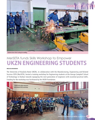 MELISSA MUNGROOThe University of KwaZulu-Natal (UKZN), in collaboration with the Manufacturing, Engineering and Related Services SETA (MerSETA), hosted a training workshop for Engineering students at the George Campbell School of Technology in Durban towards equipping the next generation of engineers with essential practical skills. Funding for the workshop was facilitated by the UKZN Foundation. MerSETA funds Skills Workshop to Empower UKZN ENGINEERING STUDENTSStudents learn Stock cutting for welding.Health and safety induction held ahead of the workshop.FEATUREUNIVERSITY OF KWAZULU-NATAL FOUNDATION 9