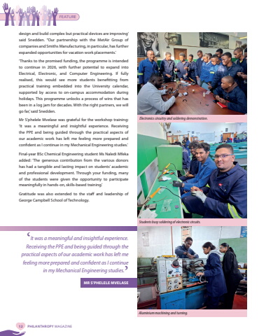 FEATURE12 PHILANTHROPY MAGAZINEdesign and build complex but practical devices are improving%u2019 said Snedden. %u201cOur partnership with the MetAir Group of companies and Smiths Manufacturing, in particular, has further expanded opportunities for vacation work placements.%u2019%u2018Thanks to the promised funding, the programme is intended to continue in 2026, with further potential to expand into Electrical, Electronic, and Computer Engineering. If fully realised, this would see more students benefitting from practical training embedded into the University calendar, supported by access to on-campus accommodation during holidays. This programme unlocks a process of wins that has been in a log jam for decades. With the right partners, we will go far,%u2019 said Snedden. Mr S%u2019phelele Mvelase was grateful for the workshop training: %u2018It was a meaningful and insightful experience. Receiving the PPE and being guided through the practical aspects of our academic work has left me feeling more prepared and confident as I continue in my Mechanical Engineering studies.%u2019Final-year BSc Chemical Engineering student Ms Naledi Mfeka added: %u2018The generous contribution from the various donors has had a tangible and lasting impact on students%u2019 academic and professional development. Through your funding, many of the students were given the opportunity to participate meaningfully in hands-on, skills-based training.%u2019 Gratitude was also extended to the staff and leadership of George Campbell School of Technology.Electronics circuitry and soldering demonstration.Students busy soldering of electronic circuits.Aluminium machining and turning.%u2018It was a meaningful and insightful experience. Receiving the PPE and being guided through the practical aspects of our academic work has left me feeling more prepared and confident as I continue in my Mechanical Engineering studies.%u2019MR S%u2019PHELELE MVELASE