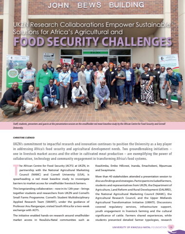 UNIVERSITY OF KWAZULU-NATAL FOUNDATION 13CHRISTINE CU%u00c9NODUKZN%u2019s commitment to impactful research and innovation continues to position the University as a key player in addressing Africa%u2019s food security and agricultural development needs. Two groundbreaking initiatives %u2013 one in livestock market access and the other in cultivated meat production %u2013 are exemplifying the power of collaboration, technology and community engagement in transforming Africa%u2019s food systems.UKZN Research Collaborations Empower Sustainable Solutions for Africa%u2019s Agricultural and FOOD SECURITY CHALLENGESStaff, students, presenters and guests at the presentation session on the smallholder red meat baseline study by the African Centre for Food Security and Cornell University.The African Centre for Food Security (ACFS) at UKZN, in partnership with the National Agricultural Marketing Council (NAMC) and Cornell University (USA), is spearheading a red meat baseline study to investigate barriers to market access for smallholder livestock farmers.This longstanding collaboration %u2013 now in its 12th year %u2013 brings together students and researchers from UKZN and Cornell%u2019s Small Farms Programme. Cornell%u2019s Student Multidisciplinary Applied Research Team (SMART), under the guidance of Professor Anu Rangarajan, visited South Africa for a two-week exchange with ACFS.The initiative enabled hands-on research around smallholder market access in KwaZulu-Natal communities such as KwaXimba, Embo Hillcrest, Inanda, Emachobeni, Mpumuza and Swayimane.More than 40 stakeholders attended a presentation session to discuss findings and strategies. Participants included farmers, students and representatives from UKZN, the Department of Agriculture, Land Reform and Rural Development (DALRRD), the National Agricultural Marketing Council (NAMC), the Agricultural Research Council, and the Upper Midlands Agricultural Transformation Initiative (UMATI). Discussions covered regulatory services, infrastructure support, youth engagement in livestock farming and the cultural significance of cattle. Farmers shared experiences, while students presented detailed farmer typologies, research