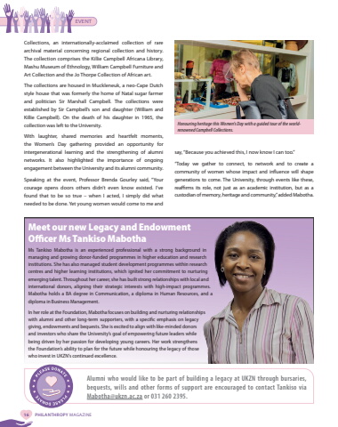 EVENT16 PHILANTHROPY MAGAZINEMeet our new Legacy and Endowment Officer Ms Tankiso MabothaMs Tankiso Mabotha is an experienced professional with a strong background in managing and growing donor-funded programmes in higher education and research institutions. She has also managed student development programmes within research centres and higher learning institutions, which ignited her commitment to nurturing emerging talent. Throughout her career, she has built strong relationships with local and international donors, aligning their strategic interests with high-impact programmes. Mabotha holds a BA degree in Communication, a diploma in Human Resources, and a diploma in Business Management.In her role at the Foundation, Mabotha focuses on building and nurturing relationships with alumni and other long-term supporters, with a specific emphasis on legacy giving, endowments and bequests. She is excited to align with like-minded donors and investors who share the University%u2019s goal of empowering future leaders while being driven by her passion for developing young careers. Her work strengthens the Foundation%u2019s ability to plan for the future while honouring the legacy of those who invest in UKZN%u2019s continued excellence. Alumni who would like to be part of building a legacy at UKZN through bursaries, bequests, wills and other forms of support are encouraged to contact Tankiso via Mabotha@ukzn.ac.za or 031 260 2395. Collections, an internationally-acclaimed collection of rare archival material concerning regional collection and history. The collection comprises the Killie Campbell Africana Library, Mashu Museum of Ethnology, William Campbell Furniture and Art Collection and the Jo Thorpe Collection of African art.The collections are housed in Muckleneuk, a neo-Cape Dutch style house that was formerly the home of Natal sugar farmer and politician Sir Marshall Campbell. The collections were established by Sir Campbell%u2019s son and daughter (William and Killie Campbell). On the death of his daughter in 1965, the collection was left to the University.With laughter, shared memories and heartfelt moments, the Women%u2019s Day gathering provided an opportunity for intergenerational learning and the strengthening of alumni networks. It also highlighted the importance of ongoing engagement between the University and its alumni community.Speaking at the event, Professor Brenda Gourley said, %u201cYour courage opens doors others didn%u2019t even know existed. I%u2019ve found that to be so true %u2013 when I acted, I simply did what needed to be done. Yet young women would come to me and say, %u201cBecause you achieved this, I now know I can too.%u201d%u201cToday we gather to connect, to network and to create a community of women whose impact and influence will shape generations to come. The University, through events like these, reaffirms its role, not just as an academic institution, but as a custodian of memory, heritage and community,%u201d added Mabotha. Honouring heritage this Women%u2019s Day with a guided tour of the worldrenowned Campbell Collections.