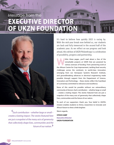 FEATURE2 PHILANTHROPY MAGAZINEMessage from the EXECUTIVE DIRECTOR OF UKZN FOUNDATIONIt%u2019s hard to believe how quickly 2025 is racing by. With the mid-year break now behind us, our students are back and fully immersed in the second half of the academic year. As we reflect on our progress and look ahead, this edition of UKZN Philanthropy is a celebration of possibility, progress and partnership.Within these pages, you%u2019ll read about a few of the remarkable projects at UKZN that are powered by various avenues of funding. From pioneering work at the African Centre for Crop Improvement, tackling food security challenges across the continent, to world-class innovation emerging from our Aerospace Systems Research Institute, and groundbreaking advances in electrical engineering made possible through support from the Department of Science, Innovation and Technology %u2013 these stories reflect the heartbeat of a university committed to relevance and excellence.None of this would be possible without our extraordinary community of donors. Each contribution %u2013 whether large or small %u2013 creates a lasting impact. The stories featured here are just a snapshot of the many acts of generosity that collectively shape lives, communities and the future of our nation.To each of our supporters: thank you. Your belief in UKZN%u2019s mission enables students to thrive, researchers to innovate and Africa%u2019s future to shine a little brighter.Warm regards,STEVE CAMPExecutive Director UKZN FOUNDATION%u2018Each contribution %u2013 whether large or small %u2013 creates a lasting impact. The stories featured here are just a snapshot of the many acts of generosity that collectively shape lives, communities and the future of our nation.%u2019