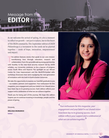 FEATUREMessage from the EDITORAs we welcome the arrival of spring, it%u2019s also a moment to reflect on growth %u2013 not just in nature, but in the heart of the UKZN community. This September edition of UKZN Philanthropy is a testament to the seeds we%u2019ve planted together %u2013 seeds of hope, innovation, empowerment and impact.This edition features stories that speak to our core mission: transforming lives through education, research and collaboration. From the groundbreaking energy partnership with Youtility to the vital food security research led by UKZN scholars, our University continues to be a beacon of progress across South Africa and beyond. The spotlight on our African Centre for Crop Improvement and the MerSETA-funded skills workshop showcases how we%u2019re equipping the next generation of innovators with the tools to build a better tomorrow.We take this opportunity to express our heartfelt gratitude to you %u2013 our readers, partners and supporters. Your enthusiasm for this magazine, your engagement and your belief in our shared vision have been key to its growing success. Each edition reflects your support and a celebration of what we can achieve together.Thank you for being part of this journey. We hope this edition inspires you to continue investing in knowledge, people and the power of giving.Sincerely, MELISSA MUNGROOEditor%u2018Your enthusiasm for this magazine, your engagement and your belief in our shared vision have been key to its growing success. Each edition reflects your support and a celebration of what we can achieve together.%u2019UNIVERSITY OF KWAZULU-NATAL FOUNDATION 3