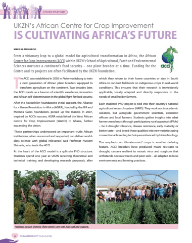 6 PHILANTHROPY MAGAZINECOVER FEATUREUKZN%u2019s African Centre for Crop Improvement IS CULTIVATING AFRICA%u2019S FUTUREMELISSA MUNGROOFrom a visionary leap to a global model for agricultural transformation in Africa, the African Centre for Crop Improvement (ACCI) within UKZN%u2019s School of Agricultural, Earth and Environmental Sciences nurtures a continent%u2019s food security %u2013 one plant breeder at a time. Funding for the Centre and its projects are often facilitated by the UKZN Foundation. The ACCI was established in 2002 in Pietermaritzburg to train a new generation of African plant breeders equipped to transform agriculture on the continent. Two decades later, the ACCI stands as a beacon of scientific excellence, innovation and African self-determination in the global fight for food security.After the Rockefeller Foundation%u2019s initial support, the Alliance for a Green Revolution in Africa (AGRA), funded by the Bill and Melinda Gates Foundation, picked up the mantle. In 2007, inspired by ACCI%u2019s success, AGRA established the West African Centre for Crop Improvement (WACCI) in Ghana, further expanding the vision.%u2018These partnerships underscored an important truth: African institutions, when resourced and respected, can deliver worldclass science with global relevance,%u2019 said Professor Hussein Shimelis, who leads the ACCI. At the heart of the ACCI model is a split-site PhD structure. Students spend one year at UKZN receiving theoretical and technical training and developing research proposals, after which they return to their home countries or stay in South Africa to conduct fieldwork on indigenous crops in real-world conditions. This ensures that their research is immediately applicable, locally adapted and directly responsive to the needs of smallholder farmers.Each student%u2019s PhD project is tied into their country%u2019s national agricultural research system (NARS). They work not in academic isolation, but alongside government scientists, extension officers and local farmers. Students gather insights into what farmers need most through participatory rural appraisals (PRAs) %u2013 be it drought tolerance, disease resistance, early maturity or better taste %u2013 and breed those qualities into new varieties using conventional breeding techniques enhanced by biotechnology.The emphasis on %u2018climate-smart%u2019 crops is another defining feature. ACCI breeders have produced maize resistant to drought, cassava resilient to mosaic virus and sorghum that withstands noxious weeds and poor soils %u2013 all adapted to local environments and farming practices.Professor Hussein Shimelis (front centre) seen with ACCI staff and students.